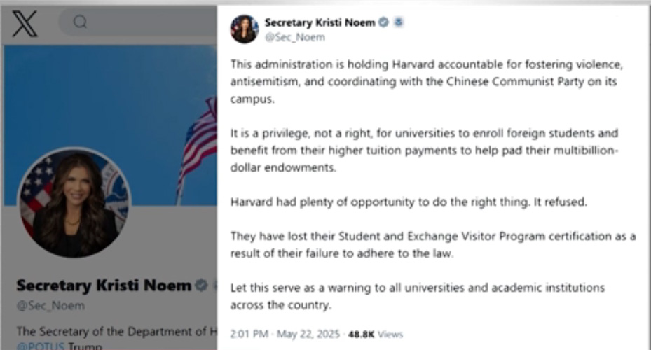 Ministrica domovinske sigurnosti Kristi Noem naredila je svom odjelu da ukine certifikat Harvardovog programa za studente i posjetitelje na razmjeni (SEVP), navodeći kao razlog da je sveučilište odbilo predati evidenciju o ponašanju stranih studenata koju je DHS zatražio prošlog mjeseca.