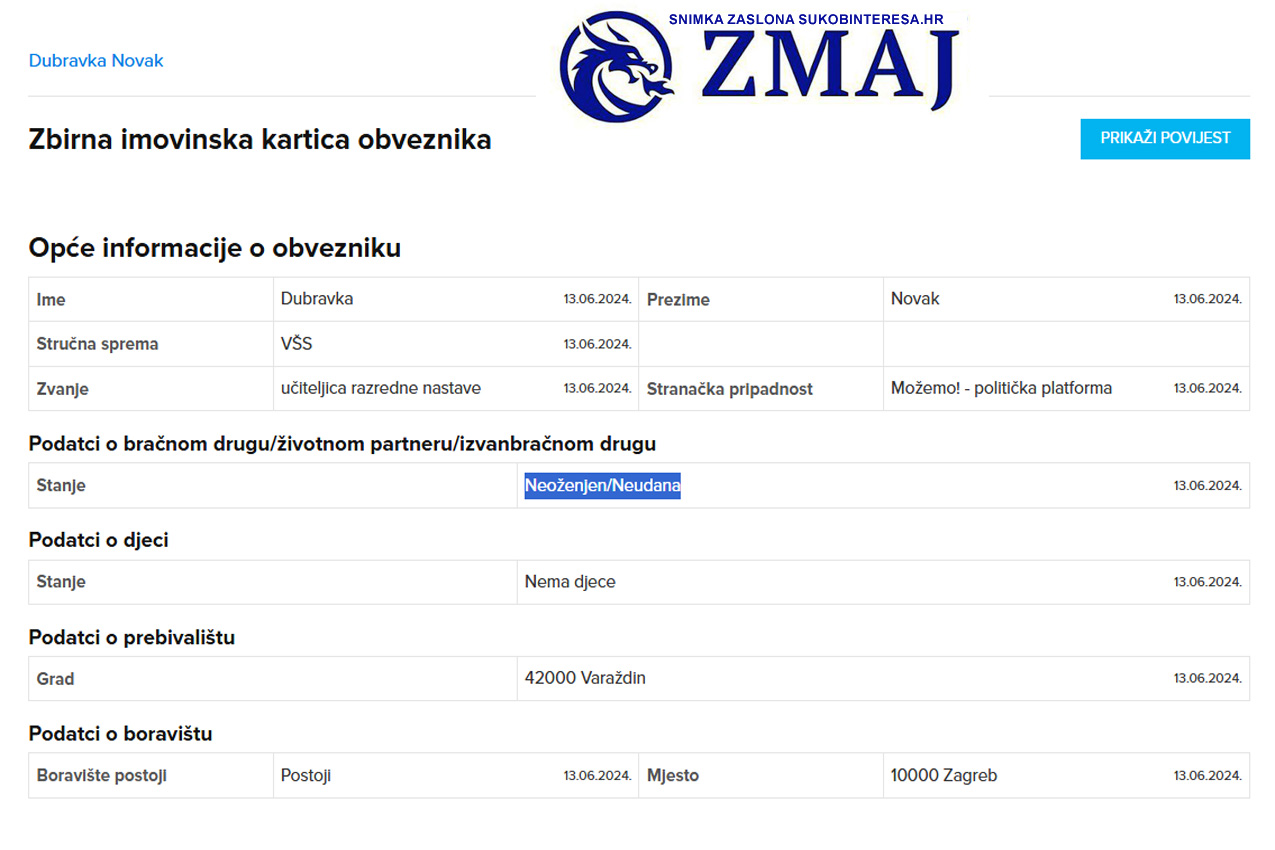 Čak površnim uvidom u imovinsku karticu, koja je obavezana za sve saborske zastupnike, pa tako i za one iz stranke Možemo!, vidljivo je kako je Dubravka Novak 13.06.2024. godine izjavila je da je Neoženjen/Neudana.