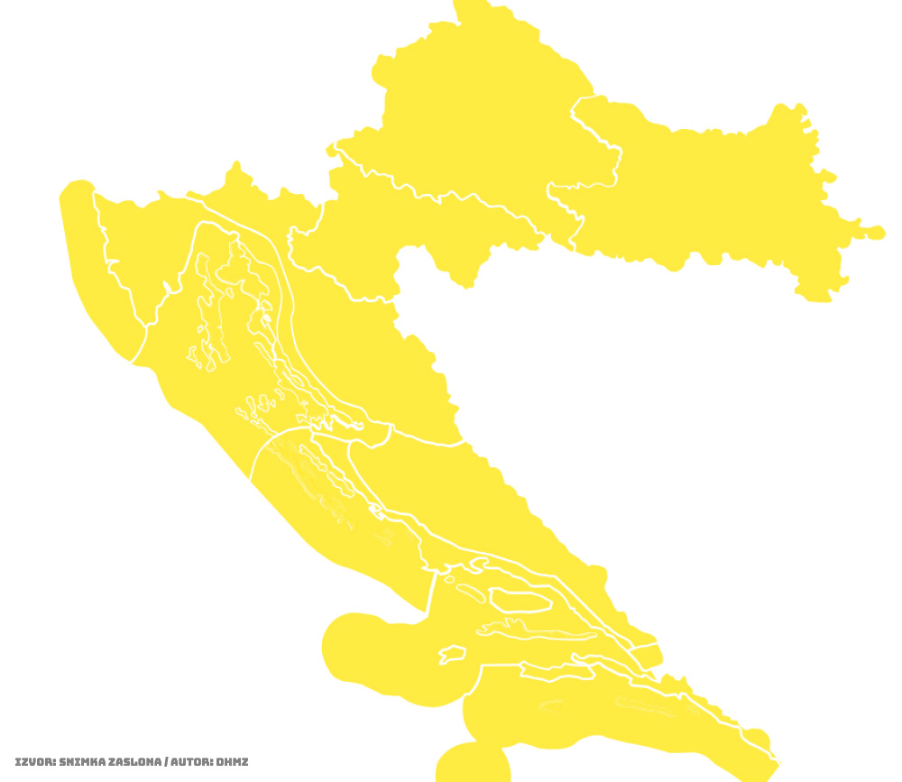Zbog obilne kiše, a mjestimično i grmljavinskih pljuskova cijeli kopneni dio pod žutim je meteoalarmom, dok se obala zažutila zbog jakog juga.