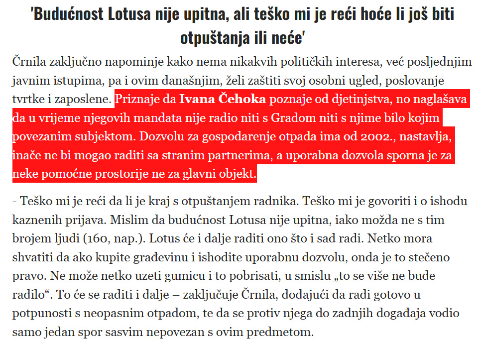 “Nemam nikakve veze s njim” Čehok je negirao kako je objavljeno na portalu Varaždinski.hr bilo kakvu povezanost sa Željkom Črnilom, vlasnikom Lotusa 91. “Ja s tim čovjekom nemam nikakve veze”, rekao je kad su u medije dospjele vijesti o nezakonitostima u toj firmi. Zašto portal Varaždinski.hr nije provjeravao te tvrdnje iako su i sami bili svjedoci “drama” u vrijeme kad je direktor Čistoće bio Davor Skroza uvrijeme mandata Čehoka nije nam poznato.