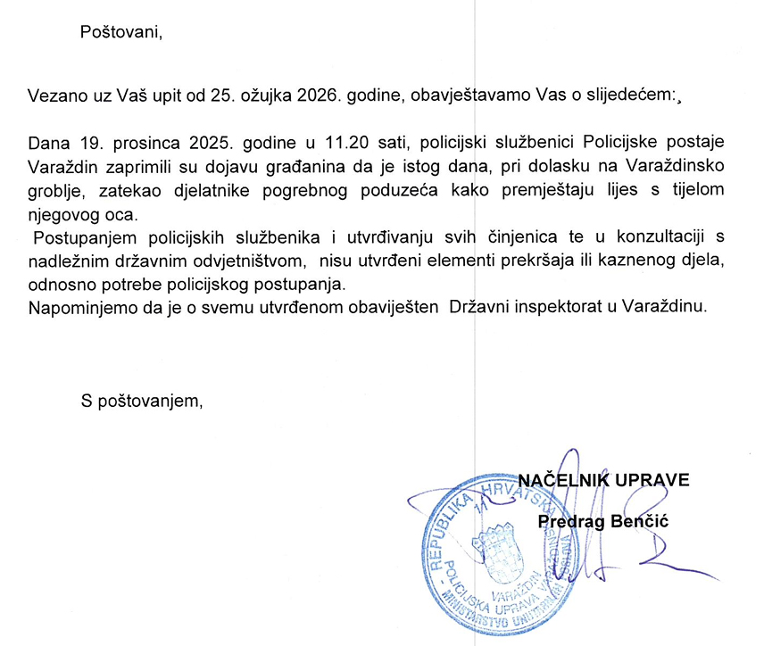 PU varaždinska, međutim, daje potpuno drugačiju informaciju. U odgovoru dostavljenom portalu potvrđuju da su djelatnici Parkova 19. prosinca 2025. premještali tijelo pokojnika iz jednog grobnog mjesta u drugo. Ova izjava izravno proturječi tvrdnjama Parkova i otvara pitanje zašto gradska tvrtka negira postupak koji policija potvrđuje.