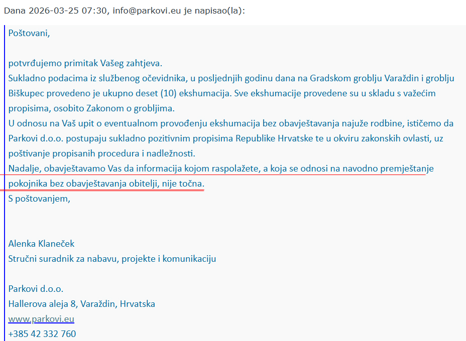 “U odnosu na Vaš upit o eventualnom provođenju ekshumacija bez obavještavanja najuže rodbine, ističemo da Parkovi d.o.o. postupaju sukladno pozitivnim propisima Republike Hrvatske te u okviru zakonskih ovlasti, uz poštivanje propisanih procedura i nadležnosti. Nadalje, obavještavamo Vas da informacija kojom raspolažete, a koja se odnosi na navodno premještanje pokojnika bez obavještavanja obitelji, nije točna.” napisala je između ostalog Alenka Klaneček.
