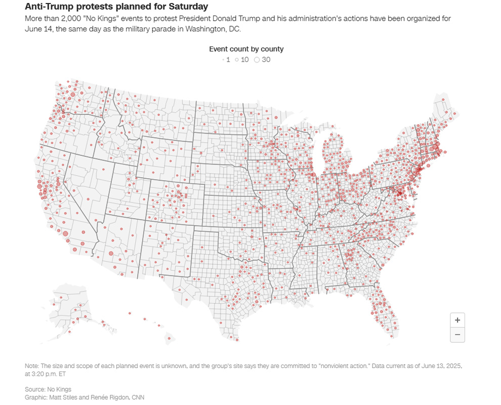 Pod motom “Nema kraljeva“, deseci tisuća građana okupili su se u mirnim, ali strastvenim prosvjedima protiv, kako navode organizatori, “autoritarnog zaokreta aktualne administracije“. Najveći prosvjedi održani su u Los Angelesu, New Yorku i Portlandu, pri čemu su neki prerasli u sukobe s policijom. U Salt Lake Cityju jedna je osoba teško ozlijeđena u pucnjavi tijekom prosvjeda, dok su u Virginiji i Teksasu zabilježeni incidenti koji su izazvali dodatnu zabrinutost za sigurnost.