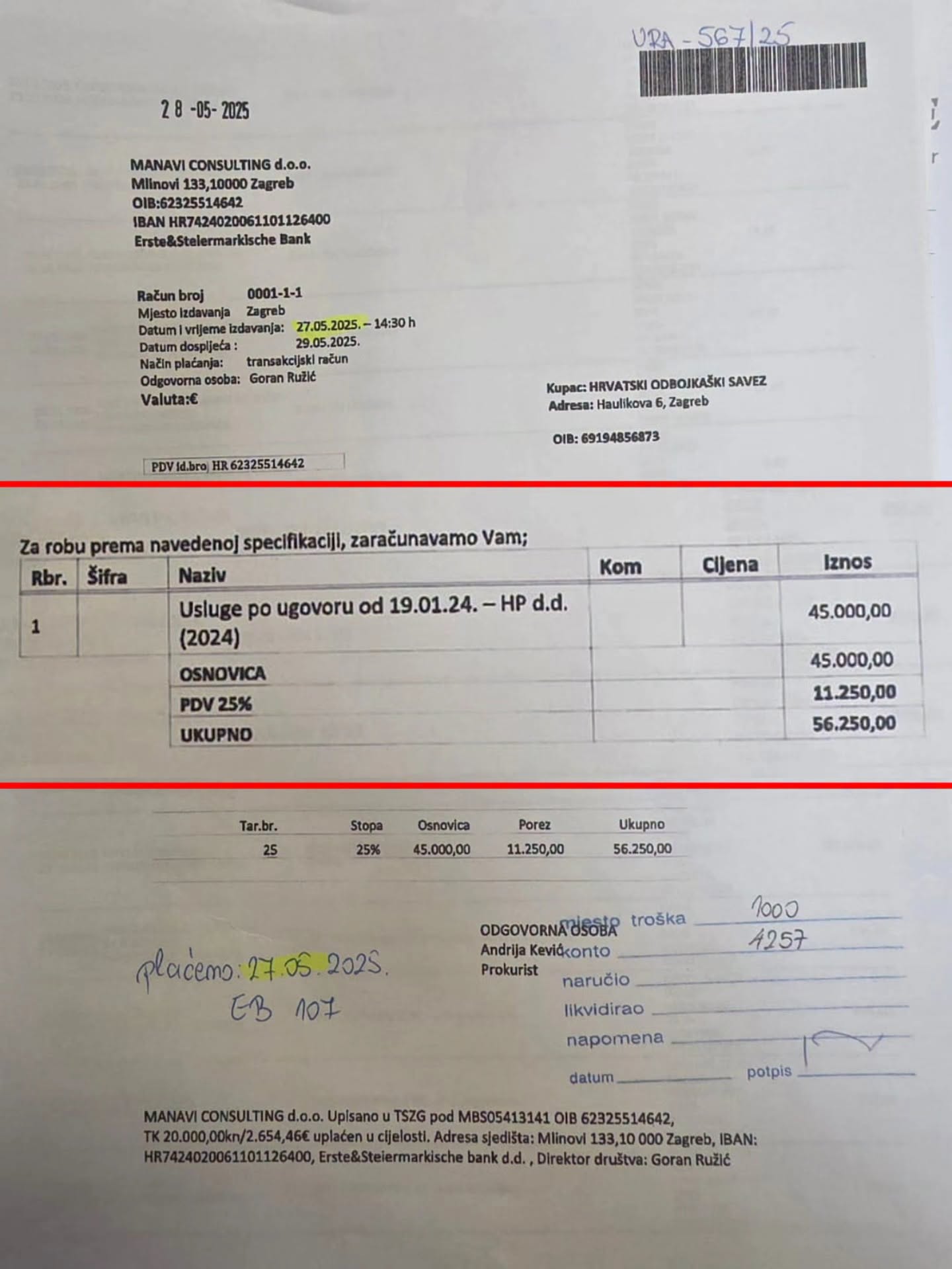 Šimunić je na društvenim mrežama objavio račun iz kojeg je vidljivo da je Hrvatski odbojkaški savez tvrtki Manavi consulting Gorana Ružića uplatio 45.000 eura plus PDV. Na računu kao poziv na broj stoji – “Usluge po ugovoru – HP d.d.”, što upućuje na povezanost s Poštinim sponzorstvom.